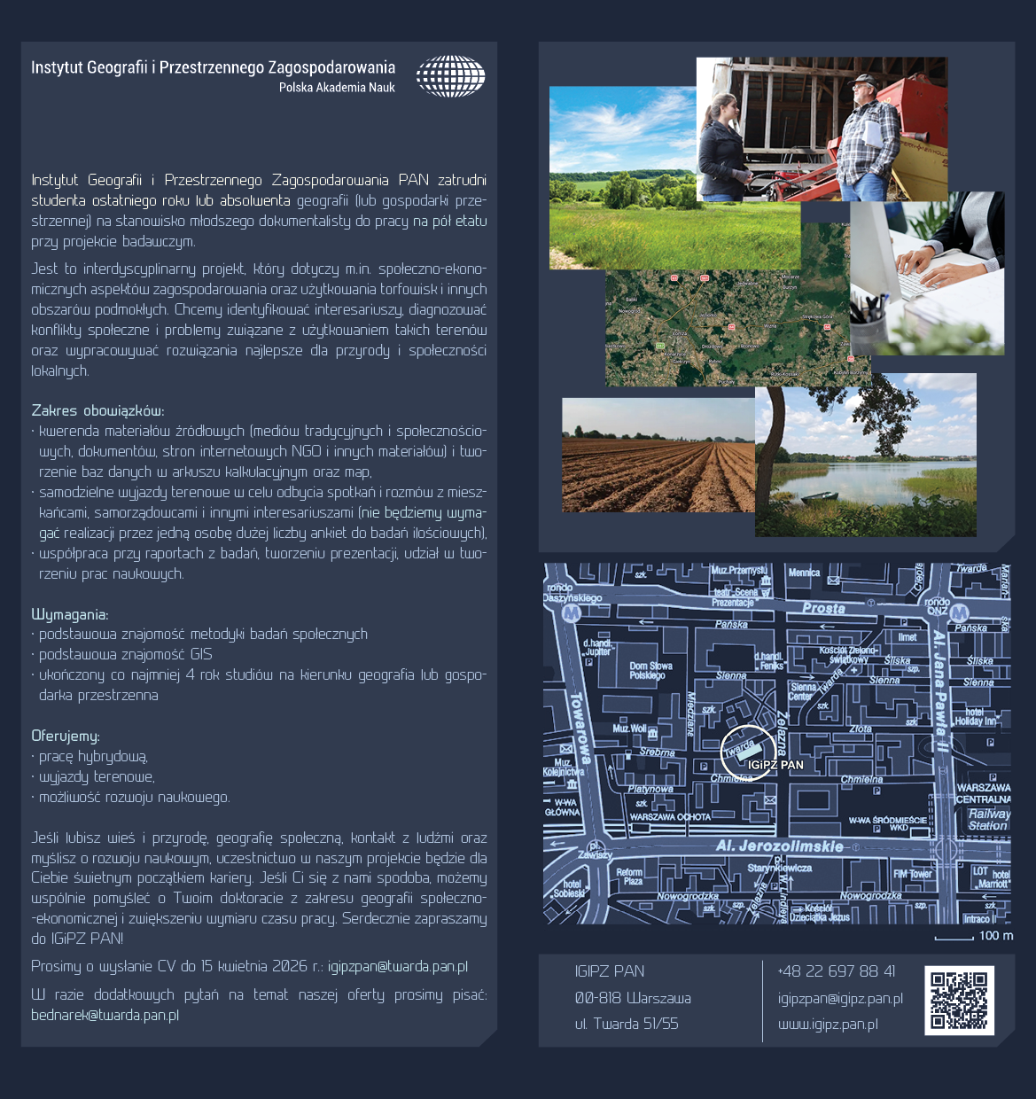 Z przyjemnością informujemy, że IGiPZ PAN zatrudni studenta ostatniego roku lub absolwenta geografii (lub gospodarki przestrzennej) na stanowisko młodszego dokumentalisty, na pół etatu, do pracy w projekcie dotyczącym społeczno-ekonomicznych aspektów zagospodarowania oraz użytkowania torfowisk i innych obszarów podmokłych. Badania, w których będzie uczestniczył nowy pracownik, będą polegały na identyfikowaniu interesariuszy, diagnozowaniu konfliktów społecznych i problemów związanych z użytkowaniem takich terenów oraz będą służyły wypracowywaniu rozwiązań najlepszych dla przyrody i społeczności lokalnych. Szczegóły ogłoszenia - PDF, ulotka.